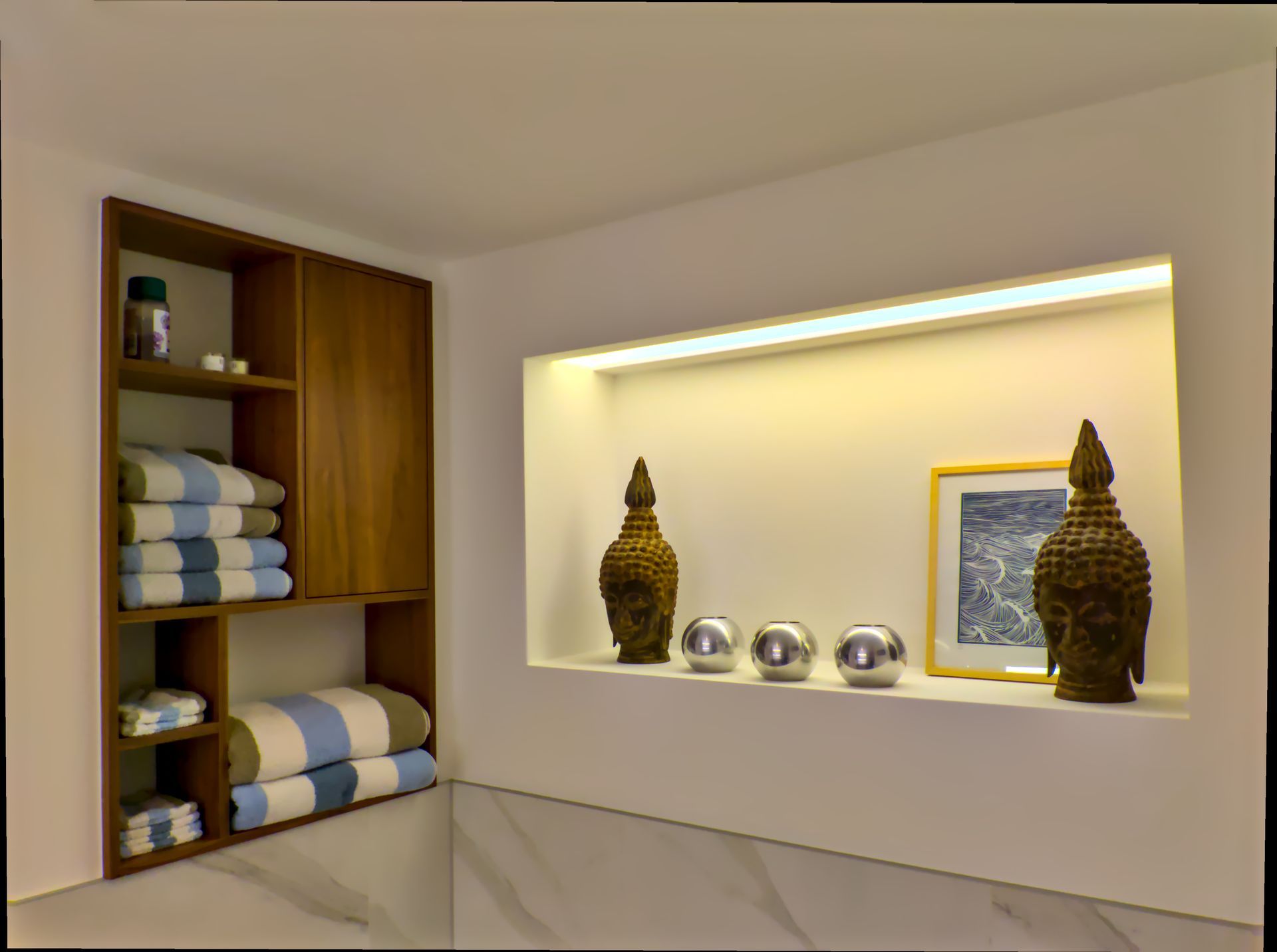 Look at this beautiful bathroom where I made the furniture under the existing sink and the padding in the two niches in the wall.